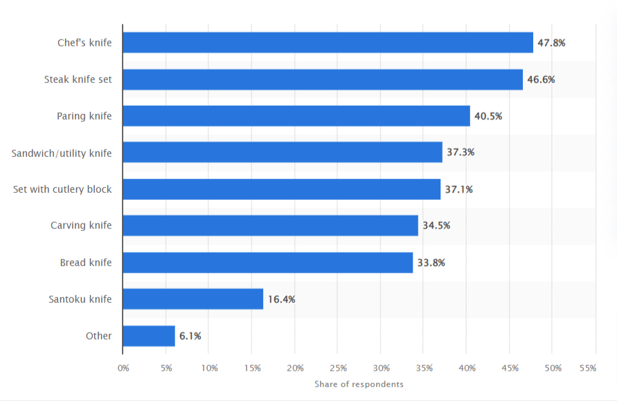 According to a survey conducted in the United States, consumers were asked about their preferred cutlery products for purchase within the next 12 months. The results indicated that 47.8% of respondents were most inclined to purchase a chef’s knife if they were to make a cutlery purchase during that period.